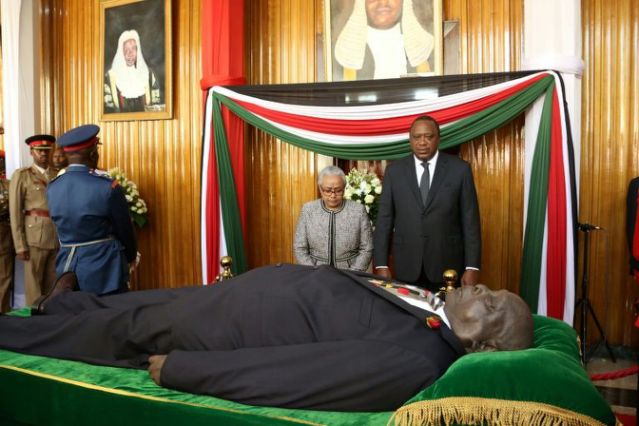 The body of the late president who towered over Kenya between 1978 and 2002 was escorted by military guard through the streets of the capital to the parliament building, drawn on a gun carriage and wrapped in the national flag.